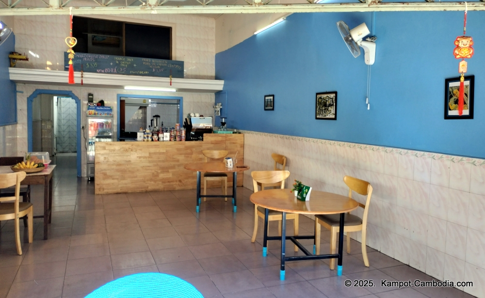 Cafe and restaurant in downtown Kampot across from ABA Bank.