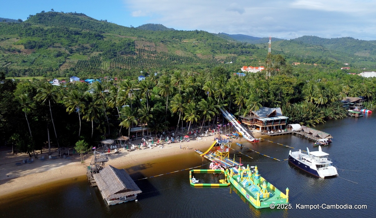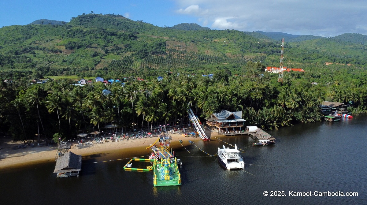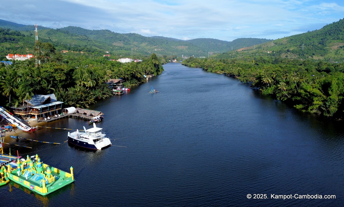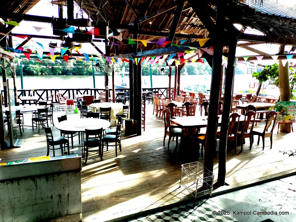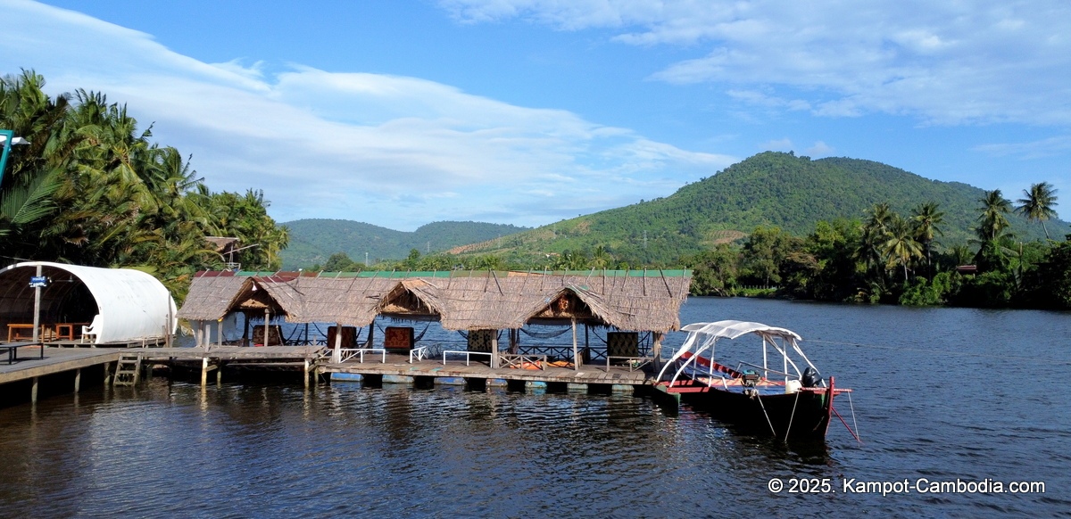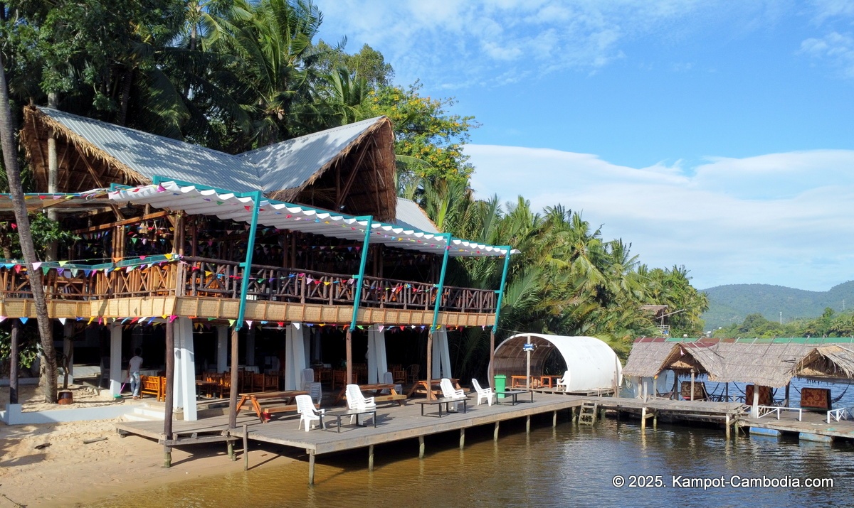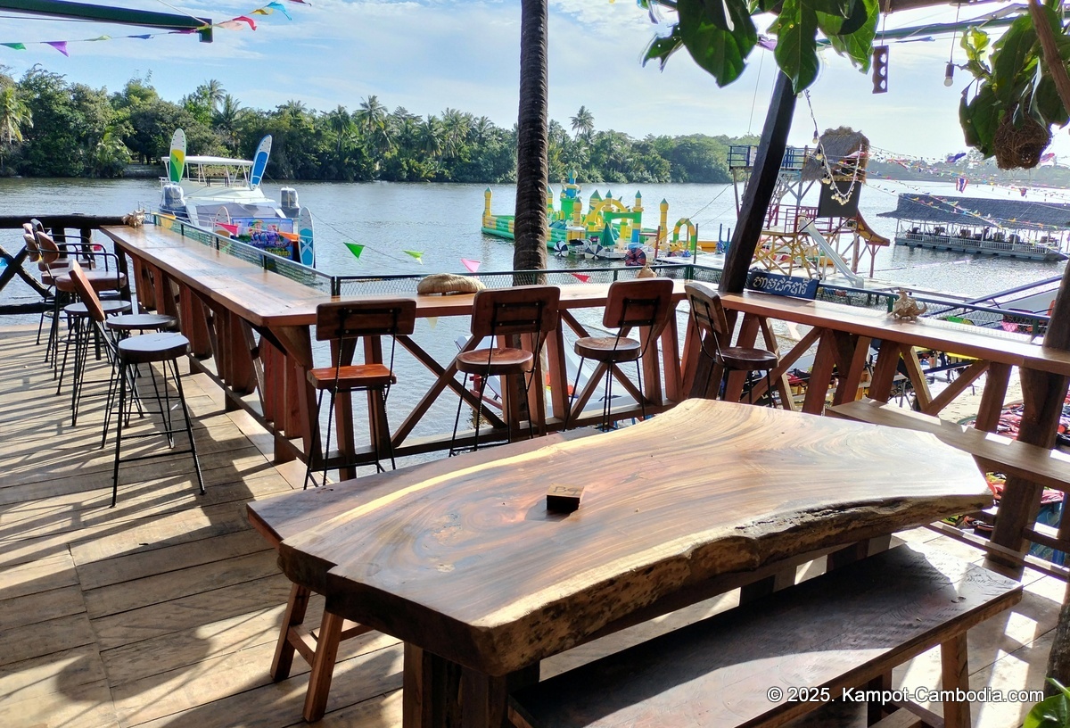 Right on the Kampot River across from downtown and upriver a few 4 or 5 kilometers, and 150 meters off the road
