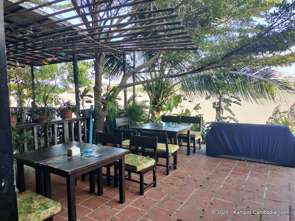 A small bar with coffee, tea and other drinks, and a seating area on the deck right on the Kampot River.